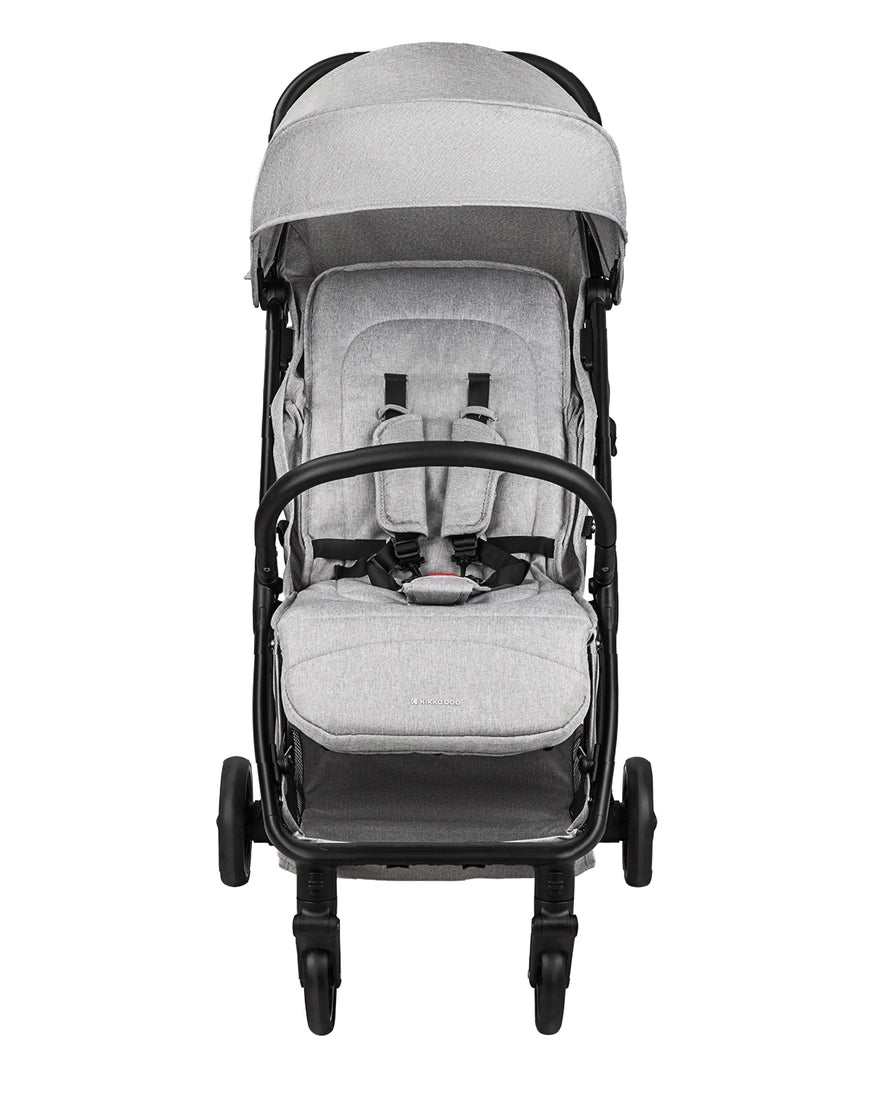 Vežimėlis turi EVA putų rankeną, stogelį su saulės skydeliu ir langeliu, nuimamą apsauginę juostą bei 5 taškų saugos diržus su pečių pagalvėlėmis ir apatiniais dangteliais. Priekiniai ratukai sukasi 360° su fiksavimo mechanizmu, o galiniai ratukai su amortizacija ir vieno mygtuko stabdžiu užtikrina sklandų ir saugų važiavimą. Nugarėlė ir pakojai reguliuojami, o po sėdyne yra patogus krepšys daiktams.