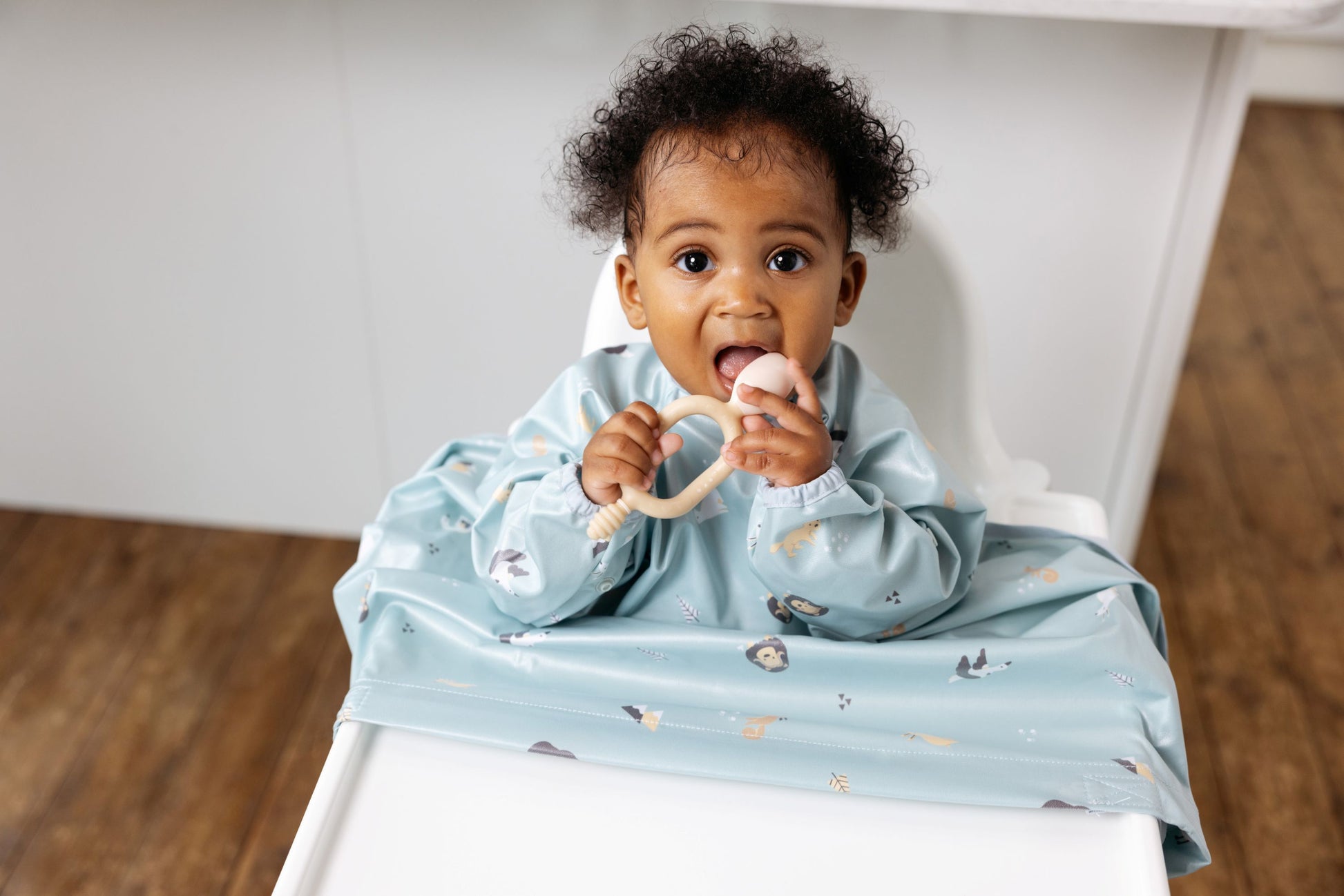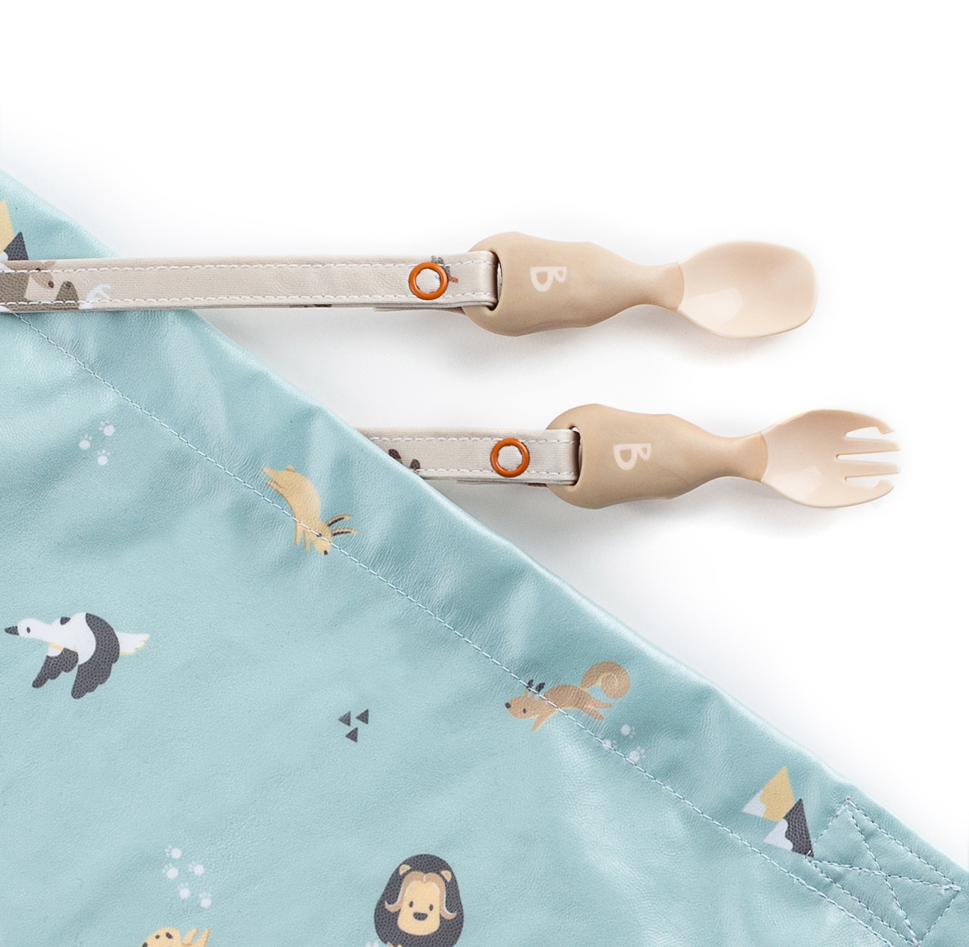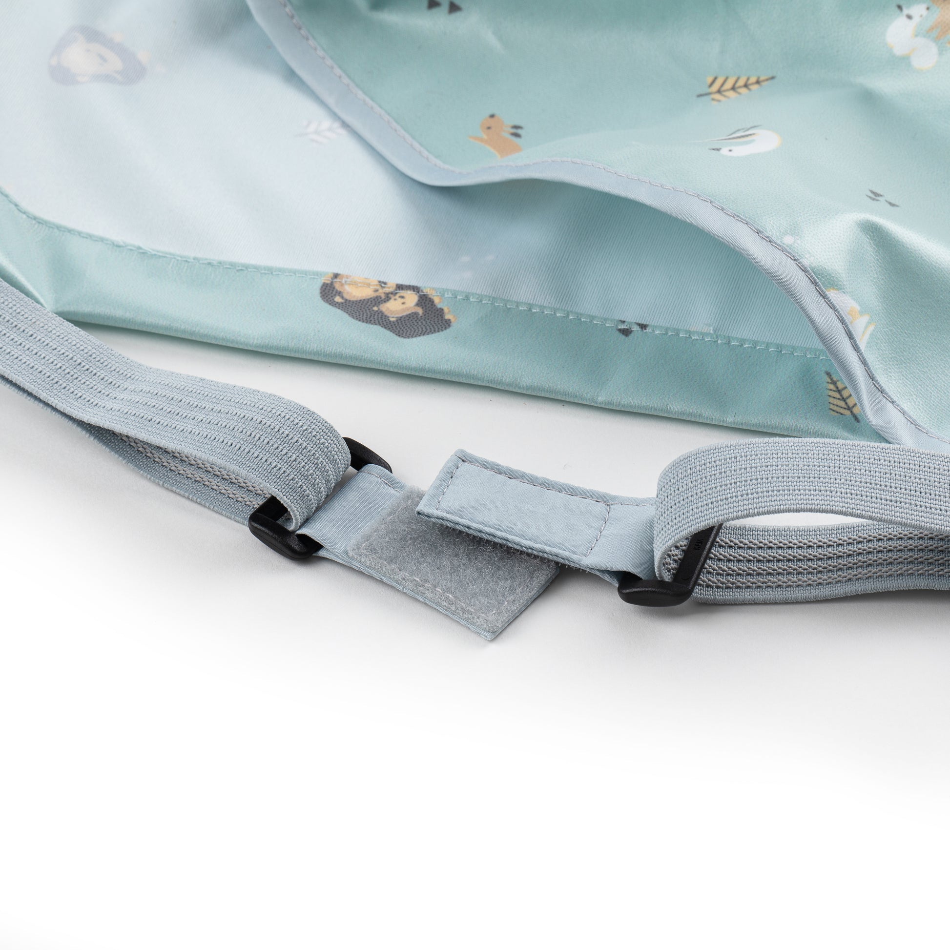 Reguliuojamas tvirtinimas po maitinimo kėdute padeda seilinukui likti savo vietoje ir apsaugo tiek vaiko drabužius, tiek kėdutę nuo nešvarumų. Kaklo srityje esantys spaustukai leidžia lengvai pritaikyti seilinuko dydį augančiam vaikui