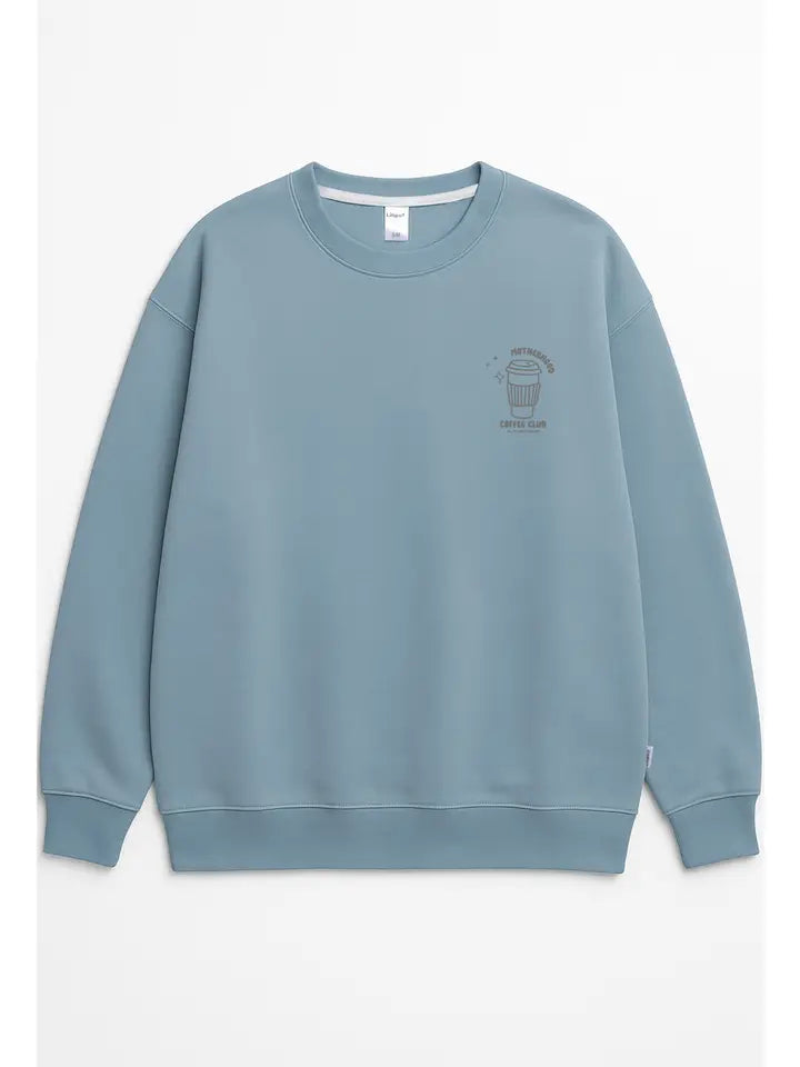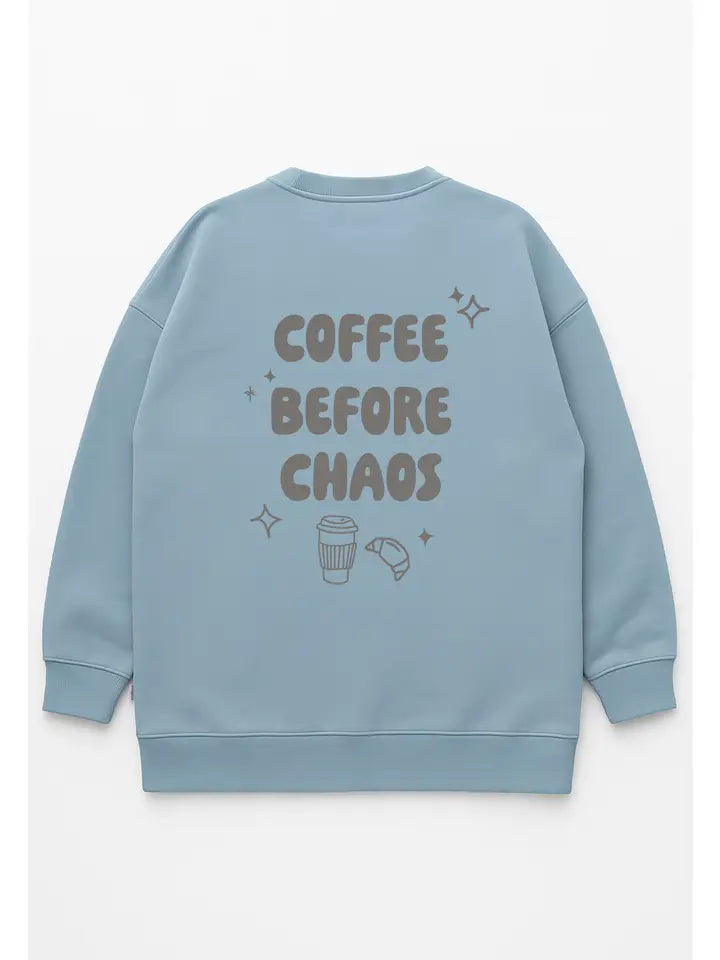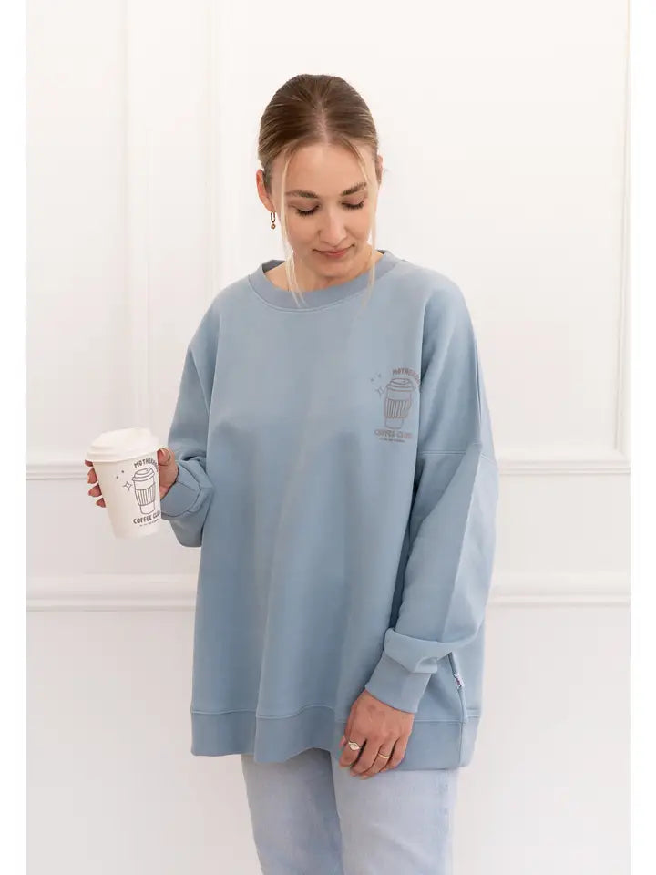 Šviesiai mėlynas džemperis sukurtas kavą mėgstantiems tėvams – minkštas, patogus ir kasdieniškas. Priekyje yra kavos puodelio spauda ir užrašas „Motherhood Coffee Club – Est. too tired to remember“ tamsiai pilka spalva. Nugaroje – žinutė „Coffee before Chaos“
