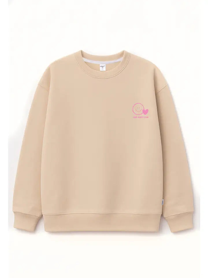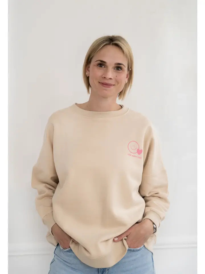 Jaukus, laisvas ir su meile sukurtas džemperis. Smėlio spalvos „Cool Aunty Club“ modelis yra oversize, su rožiniu šypsenėlės atspaudu priekyje ir užrašu „Cool Aunty Club“ nugaroje