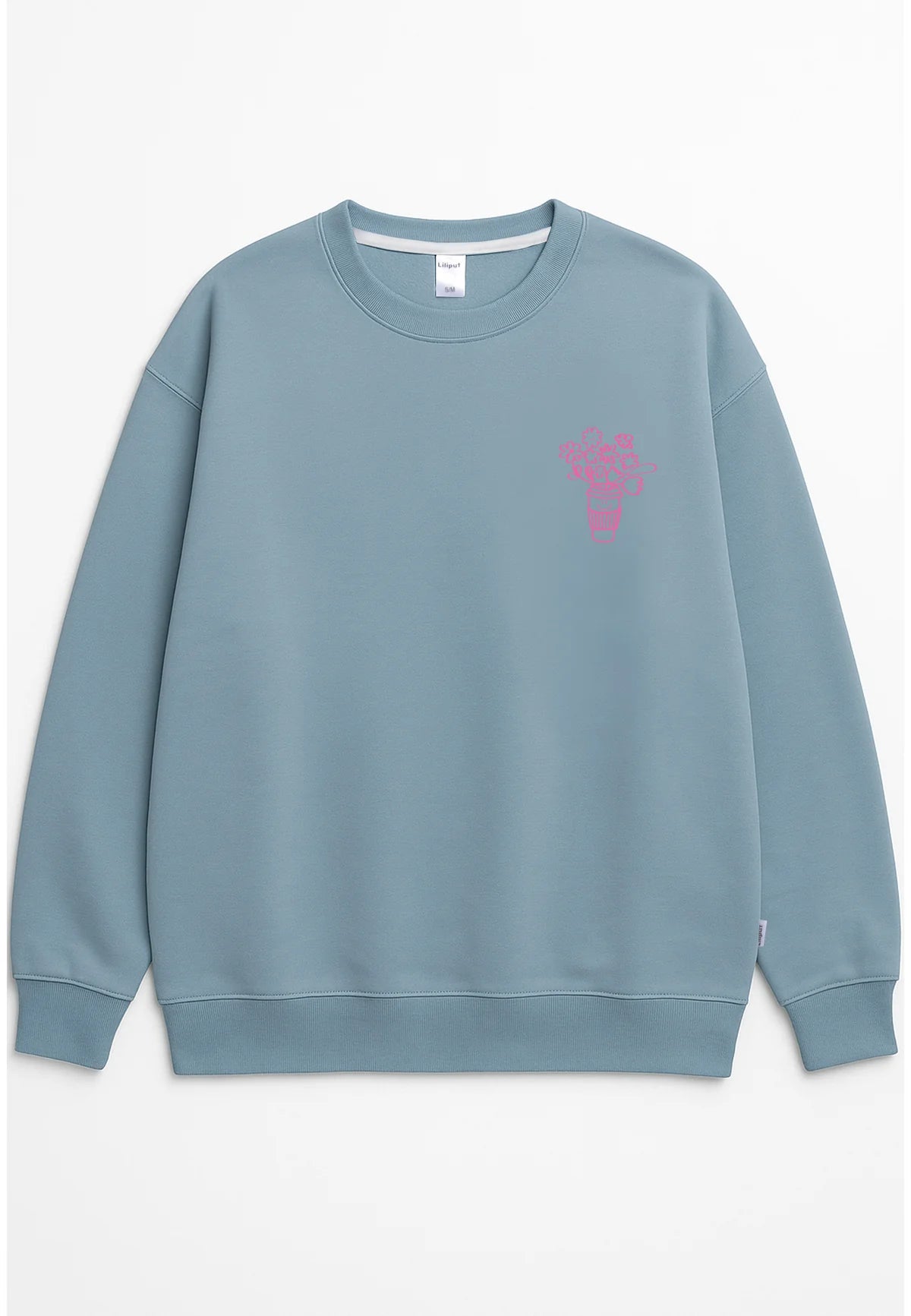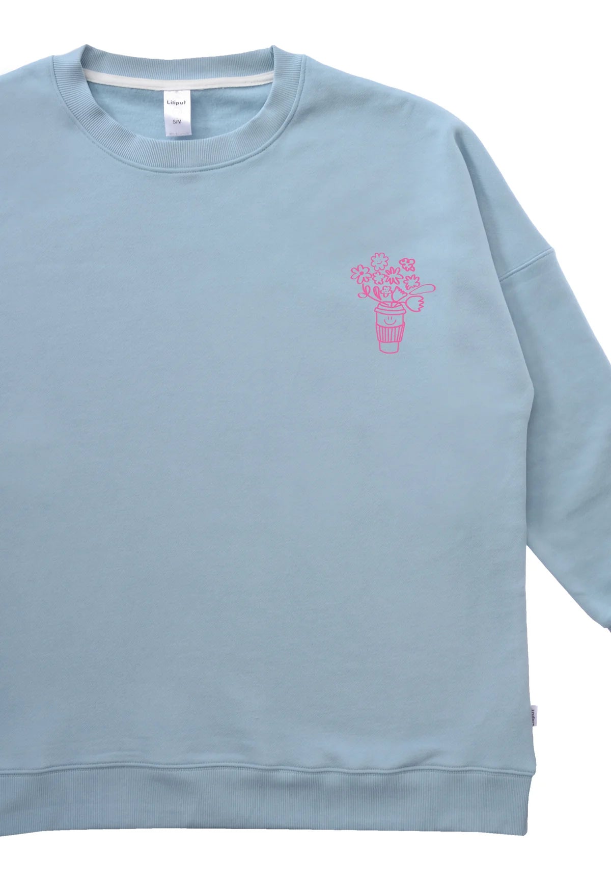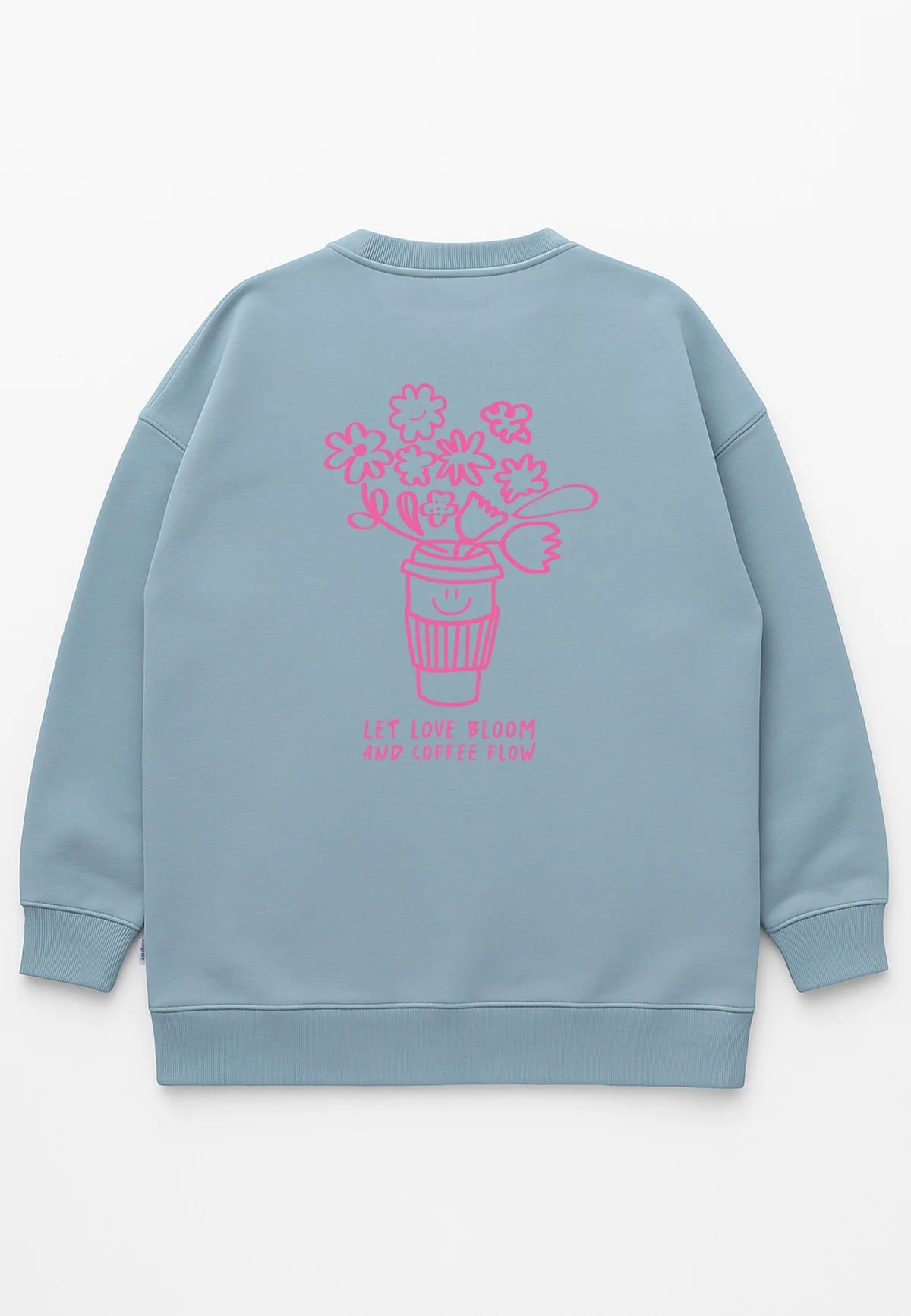 Šviesiai mėlynas „Let Love Bloom and Coffee Flow“ džemperis – jaukus pasirinkimas tiems, kuriems kava yra kasdienės rutinos dalis. Laisvo modelio, patogus ir apgalvoto dizaino: priekyje – subtilus rožinis kavos puodelis, nugaroje – žydintis puodelis su užrašu „Let Love Bloom and Coffee Flow“