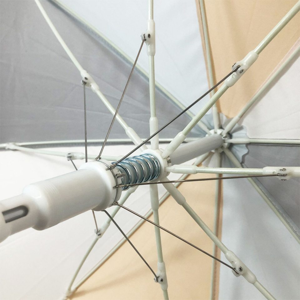 Skėčio audinys pagamintas iš perdirbto poliesterio, o rankena, spaustukai ir viršūnėlė – iš prigesintos mėlynos spalvos plastiko. Rėmas – metalinis su plastikinėmis jungtimis. Kupolo formos konstrukcija užtikrina gerą apsaugą nuo lietaus ir leidžia skėčiui atlaikyti stipresnį vėją nei plokšti skėčiai