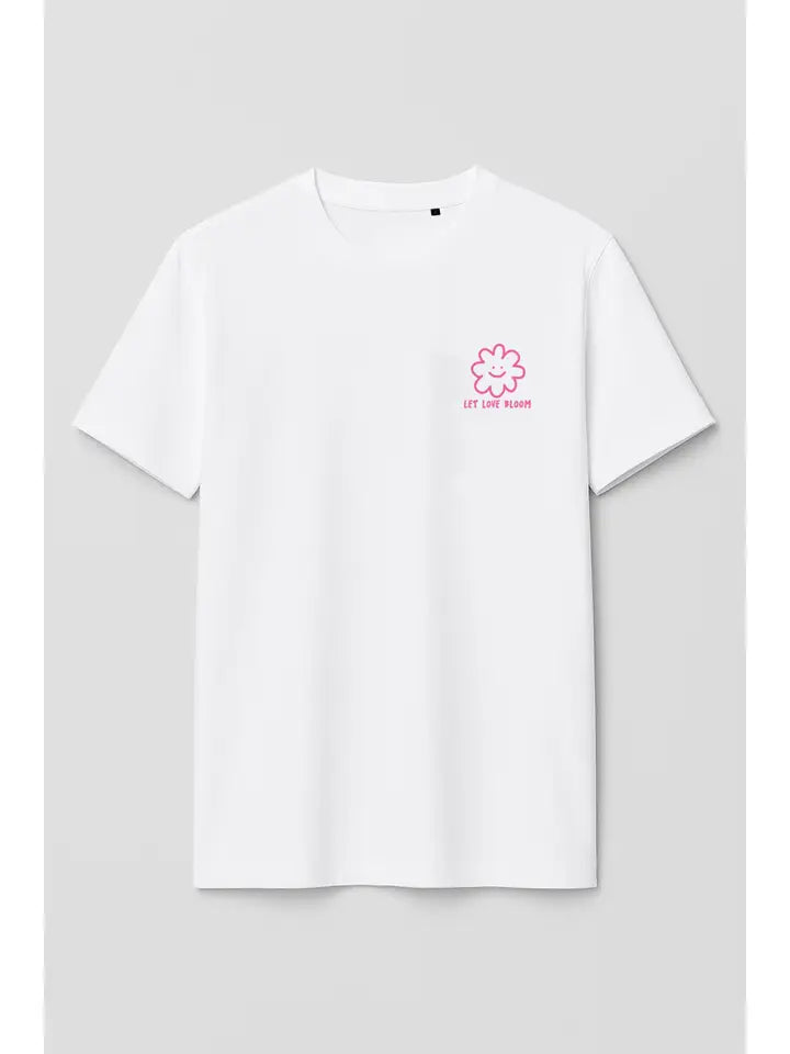 Balti unisex marškinėliai, suteikiantys kasdienybei lengvumo. Priekyje – miela gėlė ir užrašas „Let Love Bloom“, o nugaroje – gėlėtas „coffee-to-go“ puodelis su fraze „Let Love Bloom and Coffee Flow“
