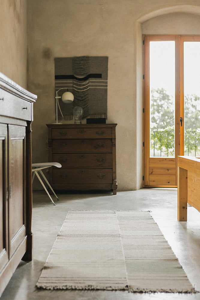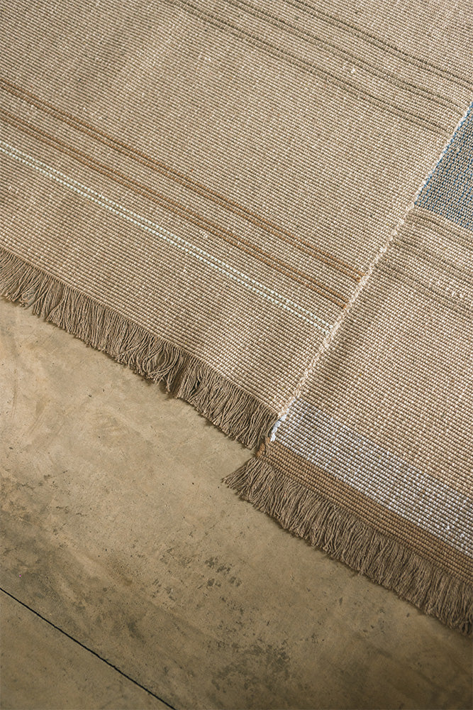 Įkvėptas Lorenos kelionės į Meksiką, šis rankomis austas kilimas atspindi tradicinio audimo dvasią per sodrų spalvų ir tekstūrų derinį. Lino sluoksnis suteikia paviršiui švelnumo, o iš perdirbtų siūlų pagaminti kutai prideda gylio ir charakterio. Kilimas užbaigtas firminiu „L“ ženklu ir matoma siūlės linija natūralių atspalvių. Rekomenduojamas profesionalus valymas.