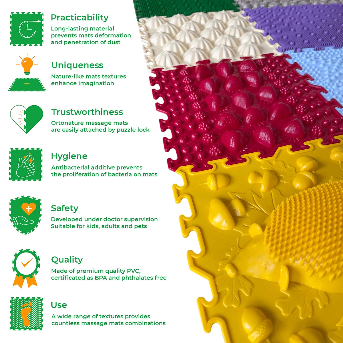 Kilimėliai pagaminti iš aukštos kokybės PVC, be BPA ir ftalatų. Jie patvarūs, lengvai prižiūrimi ir tinkami kasdieniam naudojimui. Skirtingos tekstūros gerina kraujotaką, padeda pėdų vystymuisi ir lavina vestibulinę sistemą.