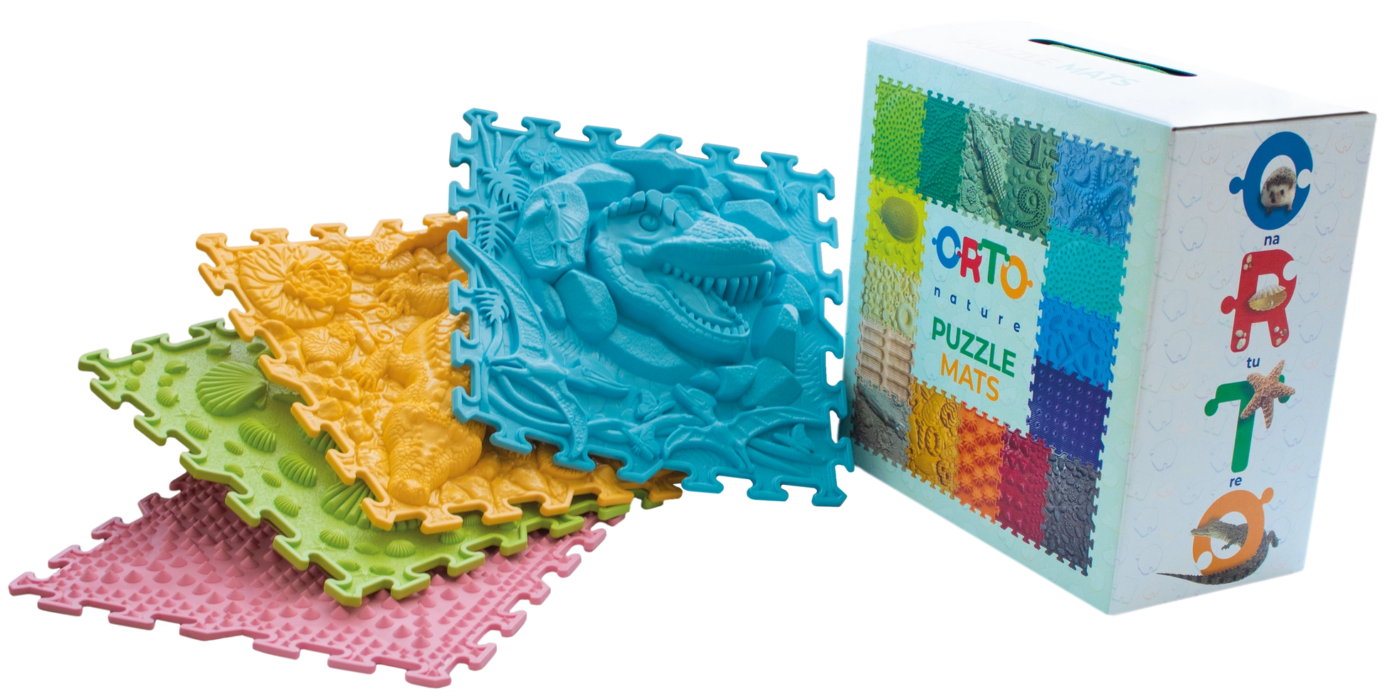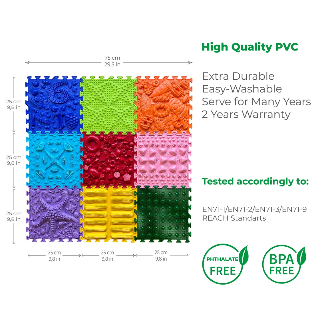 Kilimėliai pagaminti iš aukštos kokybės PVC, be BPA ir ftalatų. Jie patvarūs, lengvai prižiūrimi ir tinkami kasdieniam naudojimui. Įvairios tekstūros gerina kraujotaką, padeda pėdų vystymuisi ir lavina vestibulinę sistemą.