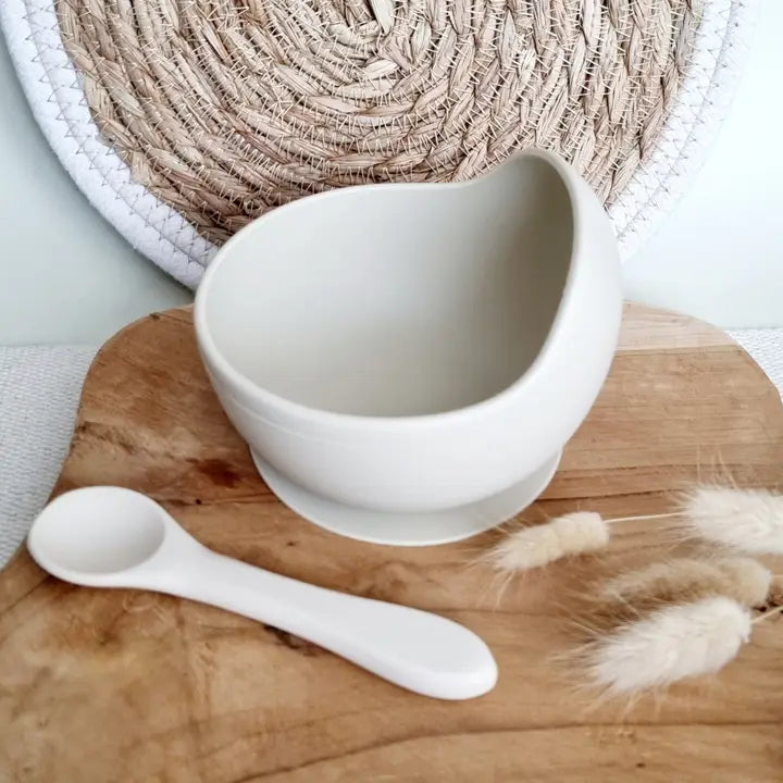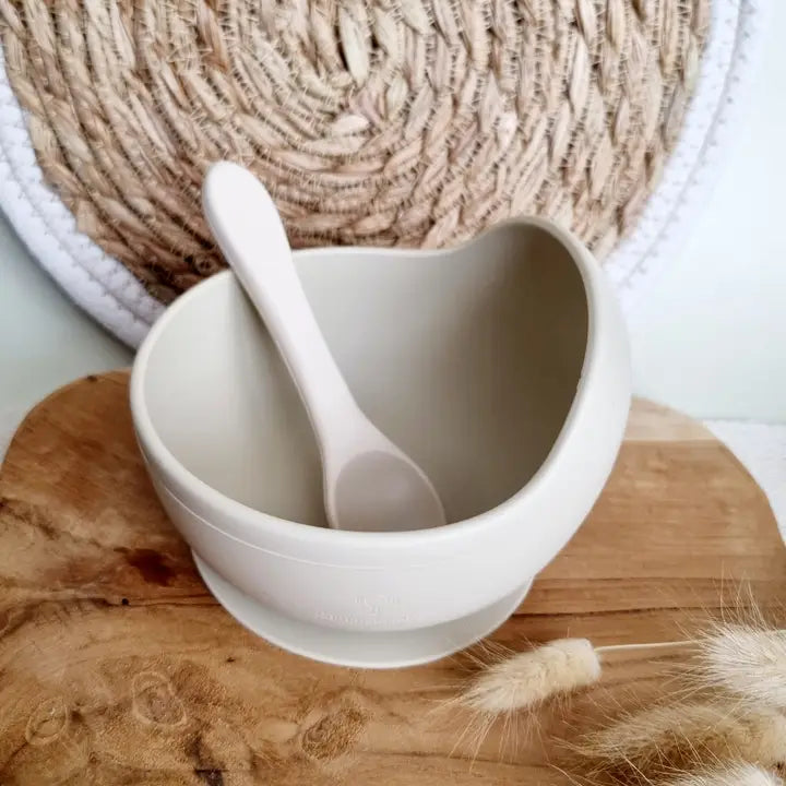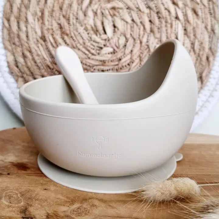 Silikoninis dubenėlis su šaukšteliu – smėlio spalvos