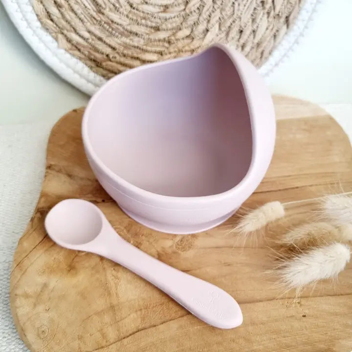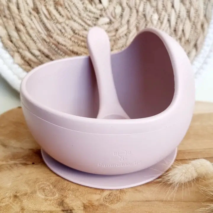 Silikoninis dubenėlis su šaukšteliu – švelniai rožinės spalvos