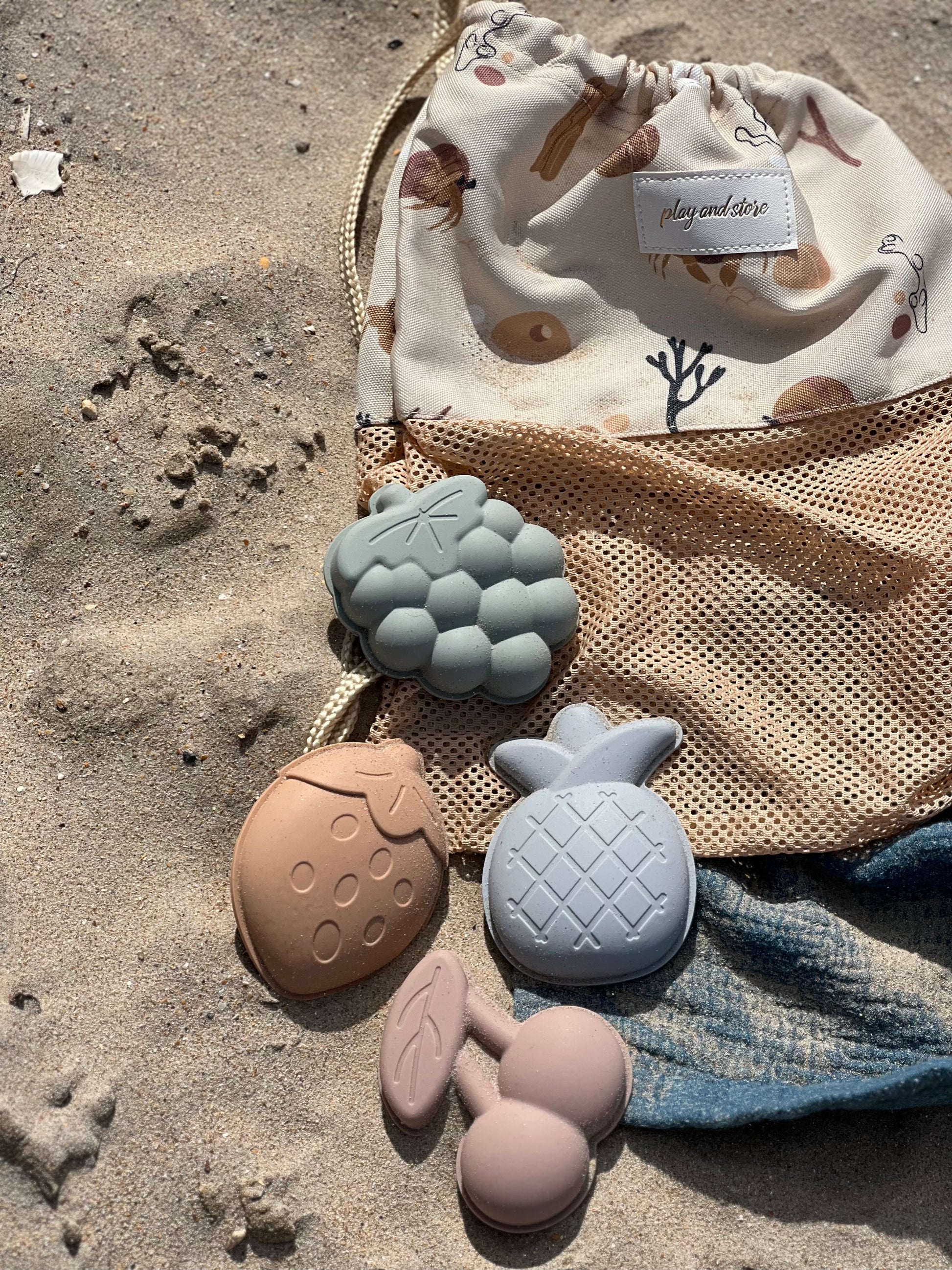 Kiekvienas „Play and Store“ paplūdimio formelių rinkinys pagamintas iš 100 % maistui saugaus silikono ir susideda iš keturių linksmų, skirtingų formų formelių. Minkštas, bet tvirtas silikonas puikiai tinka smėliui, vandeniui ir kūrybiškiems žaidimams