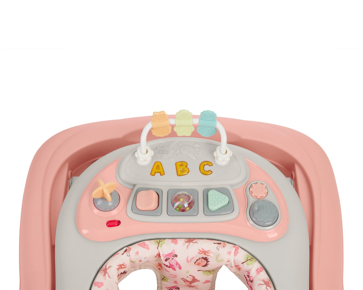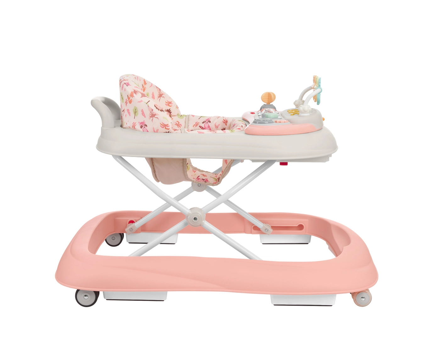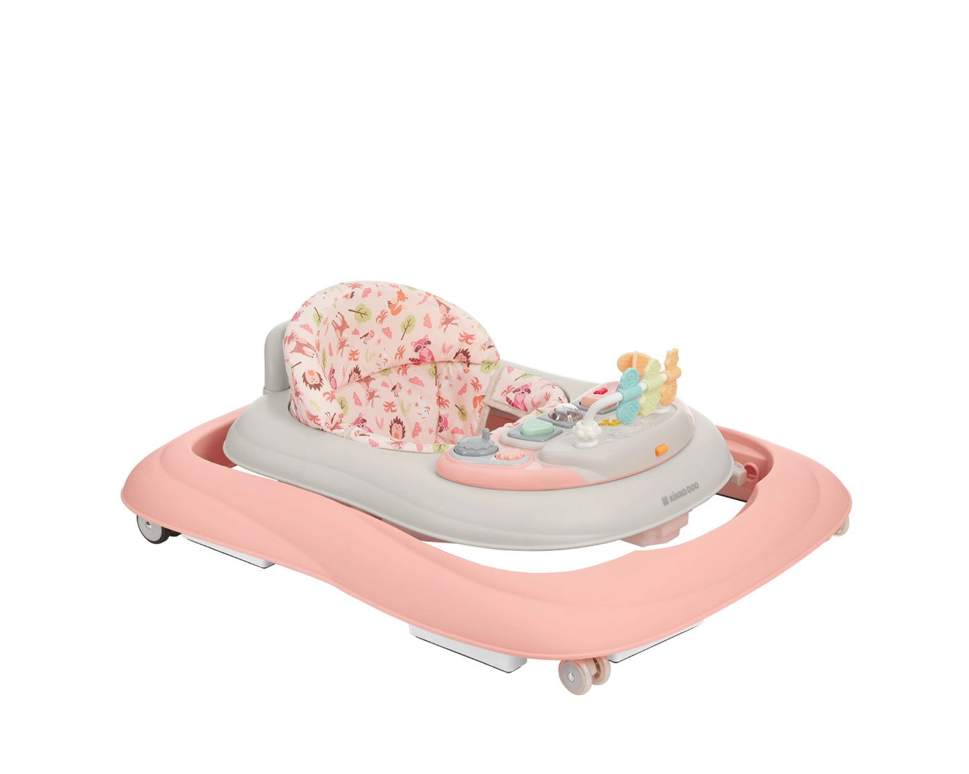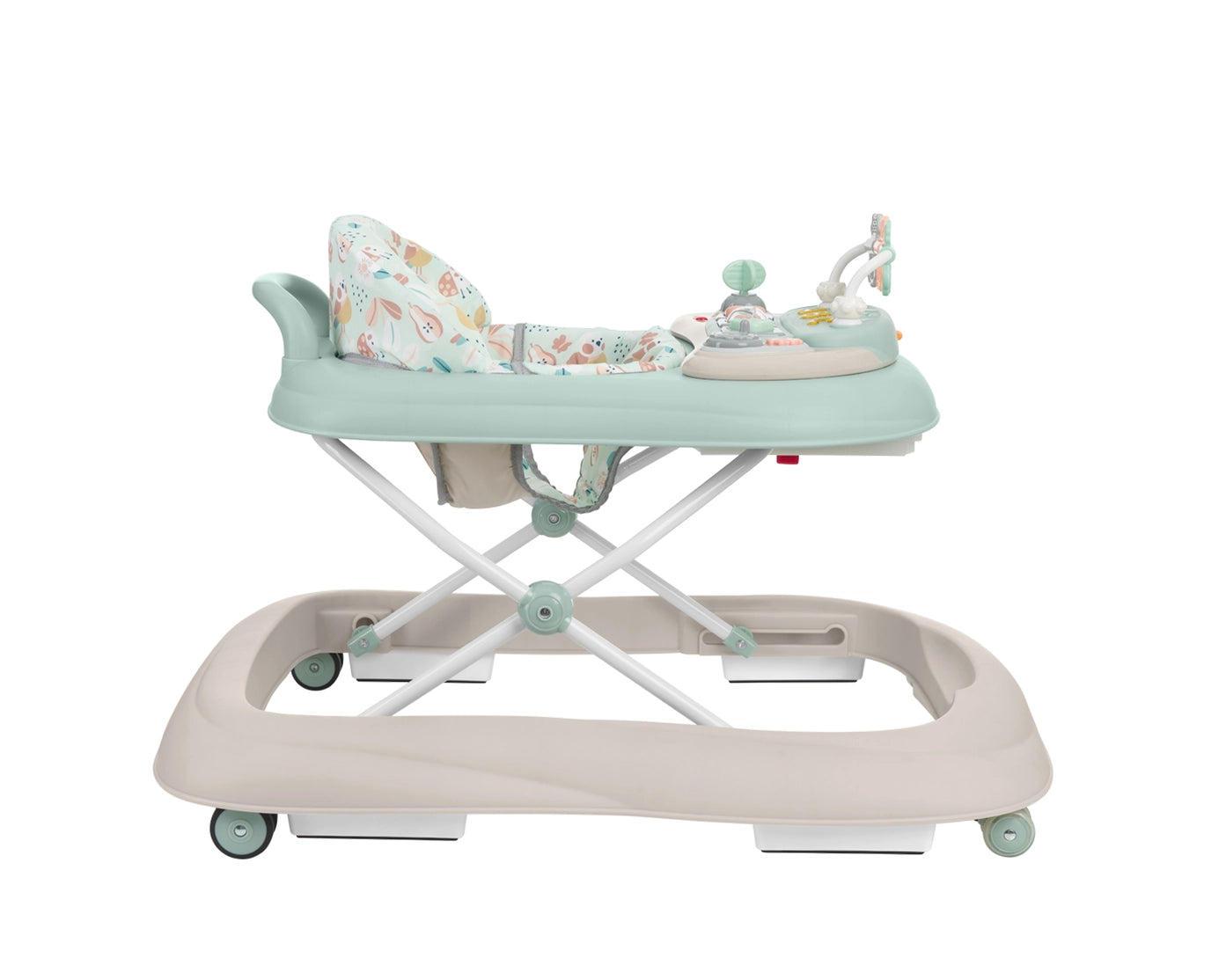 Vaikštynė turi minkštą sėdynę su aukšta nugarėlės atrama, nuimamą interaktyvų muzikos skydelį su fiksavimo mechanizmu bei ratukus, leidžiančius lengvai judėti įvairiomis kryptimis. Papildomą saugumą suteikia po pagrindu esantys guminiai stabdikliai, o sulankstomas dizainas leidžia patogiai laikyti ir transportuoti vaikštynę.