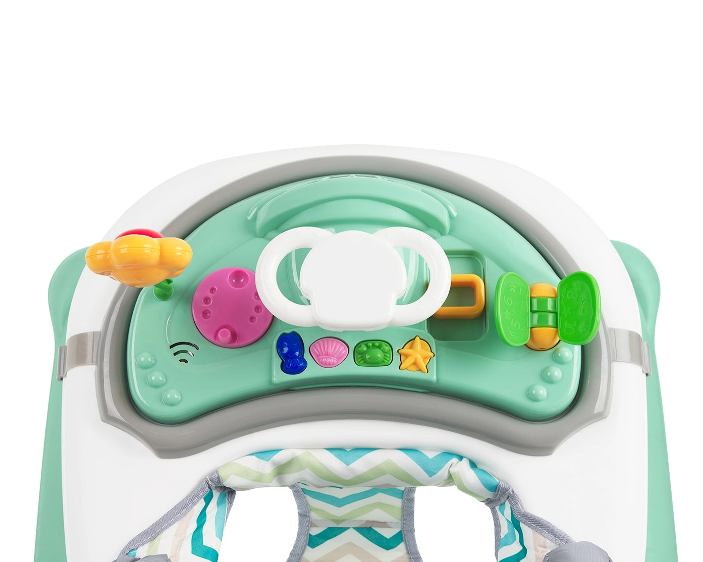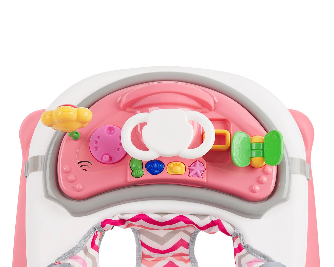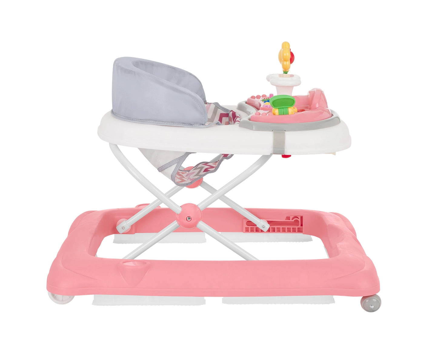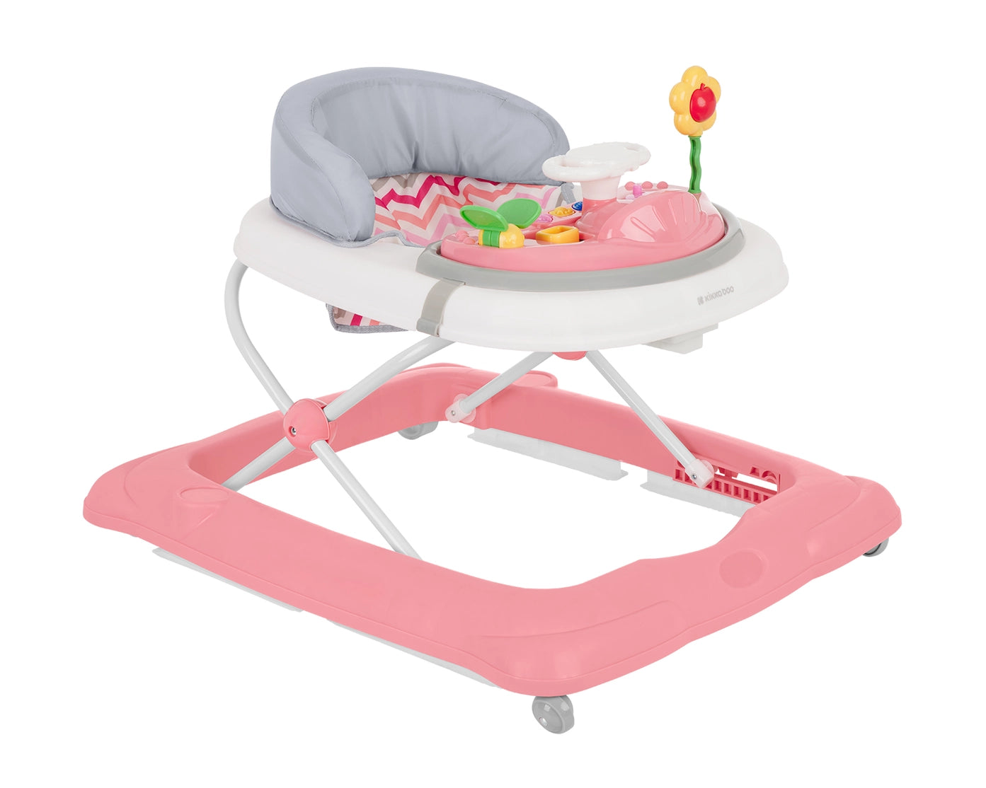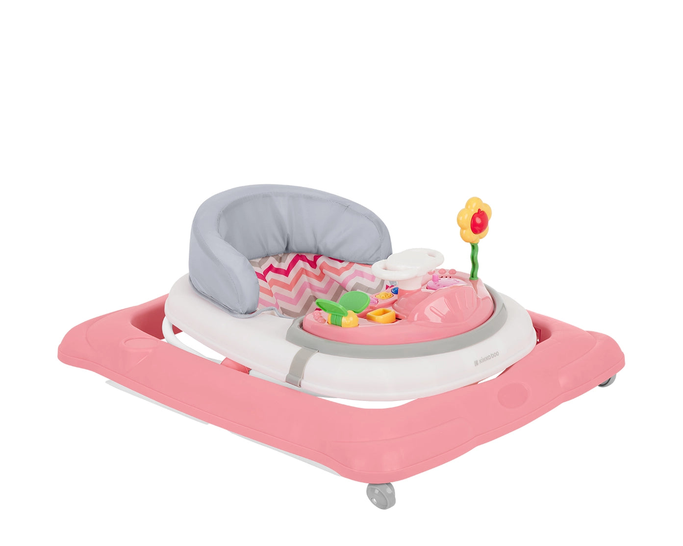 Vaikštynė turi minkštą sėdynę su aukšta nugarėlės atrama bei nuimamą interaktyvų muzikos skydelį su žaislais, kuris skatina vaiko smalsumą ir lavina pojūčius. Ratukai su 360° sukimosi funkcija leidžia lengvai judėti, o papildomą saugumą suteikia po pagrindu esantys guminiai stabdikliai. Sulankstomas dizainas leidžia patogiai laikyti ir transportuoti vaikštynę.
