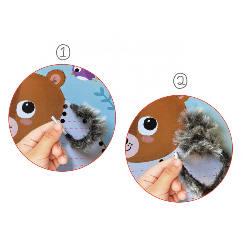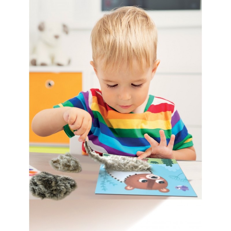 Vaikai kurs minkštus miško gyvūnų kailiukus naudodami vėrimo korteles ir vilną